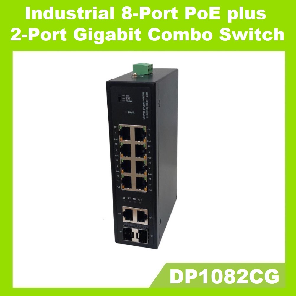 DP1082CG is a hardened 8-port 10/100Mbps with IEEE802.3af/at PoE+ Switch, plus 2-port uplink Gigabit Combo port with RJ45/SFP connectors. All the PoE ports may support up to 30W per port basis. Each of the uplink Gigabit Combo port supports either RJ45 or SFP connector. It means only one of the connector RJ45/SFP can be linked at a time on Gigabit Ethernet for the COMBO port. If both RJ45/SFP connectors of the same COMBO port are connected at the same time, the SFP port will be linked with priority.